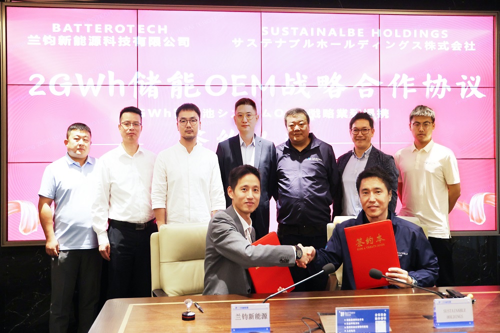 10月10日下午,兰钧新能源科技有限公司与日本知名新能源开发商SUSTAINABLE HOLDINGS在兰钧新能源嘉善基地举行2GWh储能集成系统OEM战略合作协议签约仪式。永青科技集团战略协同部副总经理张奕炜,兰钧新能源副总经理兼首席营销官黄炳辉及SUSTAINABLE事业部长山内雅贵等相关领导出席见证本次签约仪式。兰钧新能源海外营销解决方案主管姜兴与SUSTAINABLE会长安富辉代表双方签署合作协议。