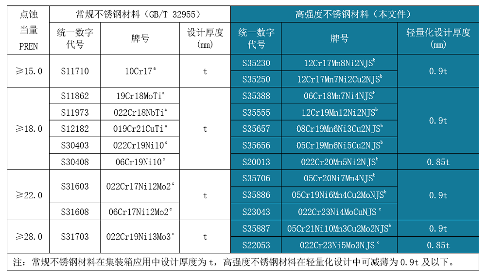 经济型高强度不锈钢,包括QN系列奥氏体不锈钢及QD2001双相不锈钢在保持良好耐蚀性、焊接性和冷加工性的基础上显著提升了强度,可助推集装箱及家电等领域的产品轻量化设计。新发布的行业标准中推荐,高强度不锈钢相对常规产品可减薄10%-15%(详见表1~表3),这对于产业链节能减排和可持续绿色发展具有重要意义。