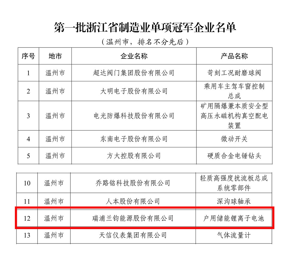 近期,浙江省经济和信息化厅公布了浙江省首批制造业单项冠军企业名单,瑞浦兰钧能源股份有限公司成功上榜!